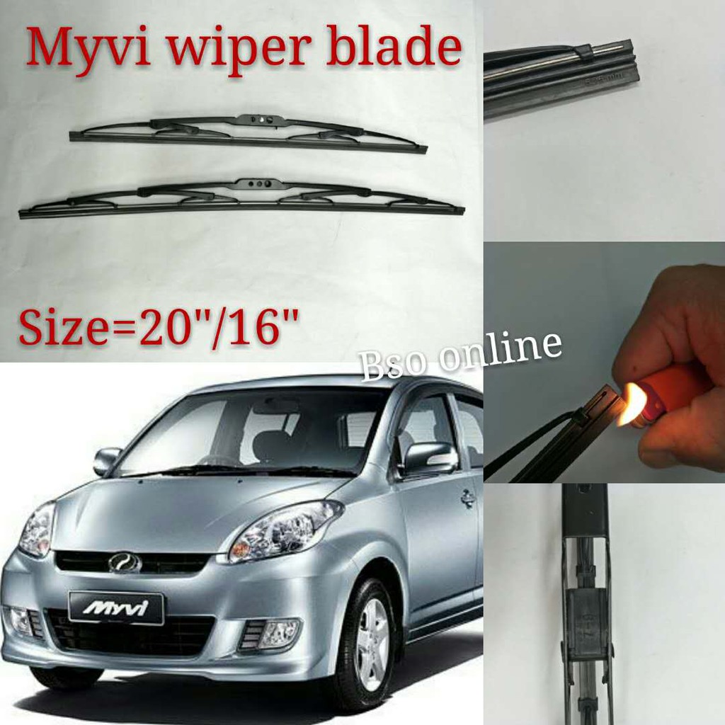 View full size · 2 people like this. Check your wiper size before purchase. Bosch front wiper blade for perodua myvi 1.3 1.5 lagi best size 16 + 20 inci ba2016 ( 2 pieces / 1 pair ). Actually 16 or 17 also usable. 2x universal wiper blade refill cut to size replacement rubber wiper strip 26 . Front and rear wiper blades for perodua myvi hatchback 2006 onwards models. Gap high performance wiper blade set for perodua myvi (17/21). Applications for 98% of all vehicles; 7cm x 6cm x 59cm ; Based on the daihatsu boon the myvi is .